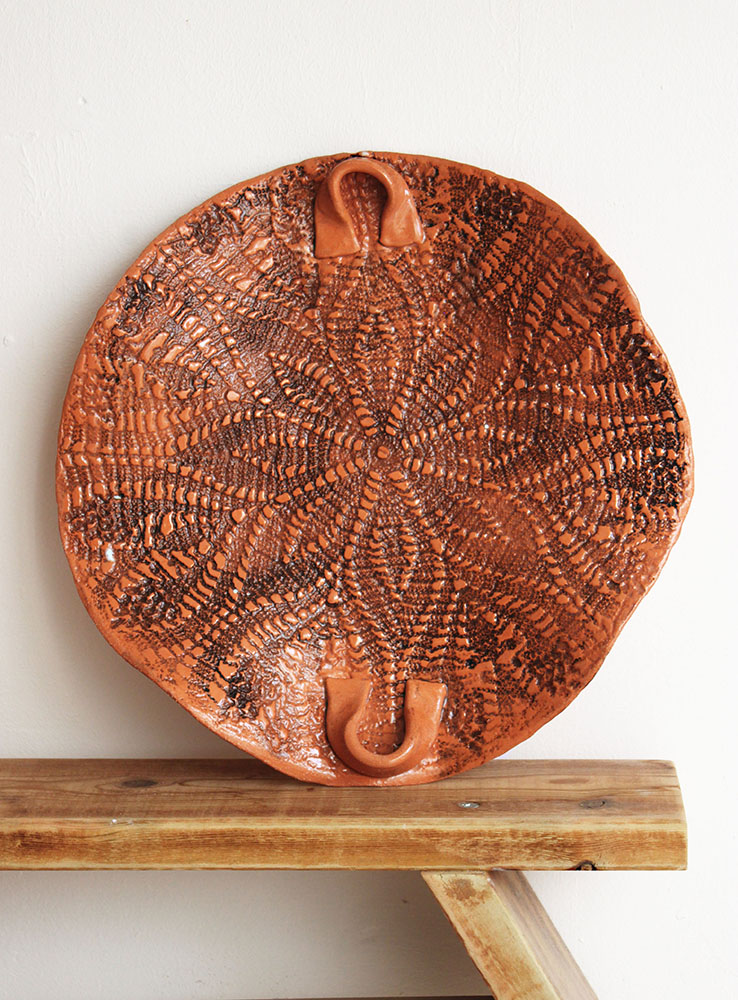 Rustic geometric design with natural textile imprint. Price: 150₪ (~$15) – Sold